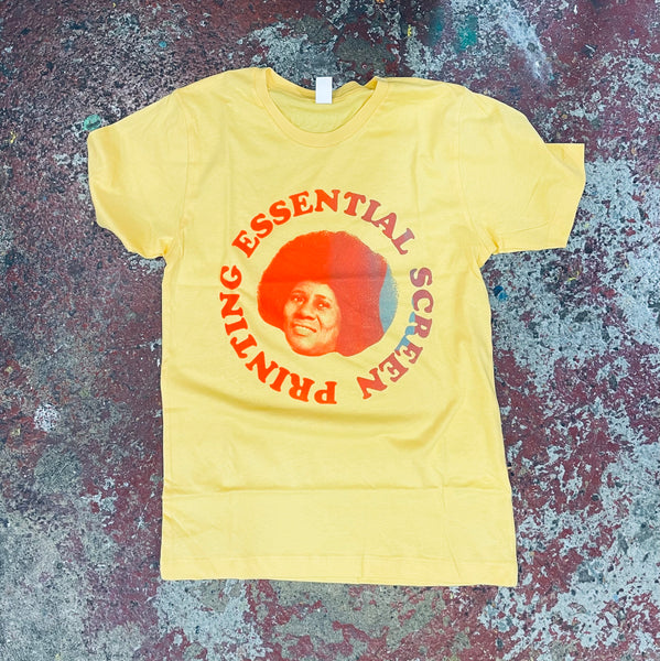 Limited run Alice Coltrane ESP print on a muted golden yellow. Soft, garment-dyed cotton with a relaxed unisex fit.