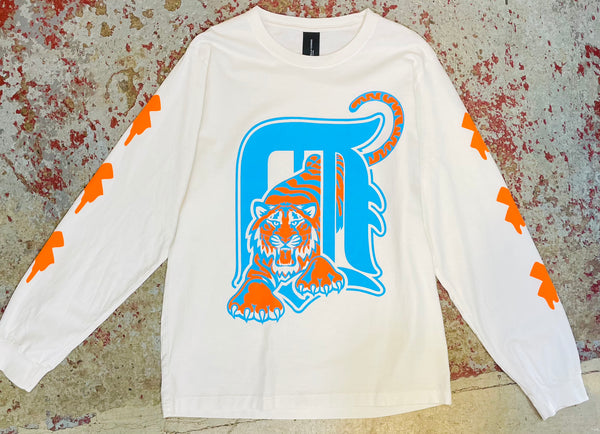 Orange and blue water-based prints wrap this one from front to sleeve. Printed on soft parchment Comfort Wash Long Sleeve Tee. Vintage Detroit colorway, redrawn and reimagined.